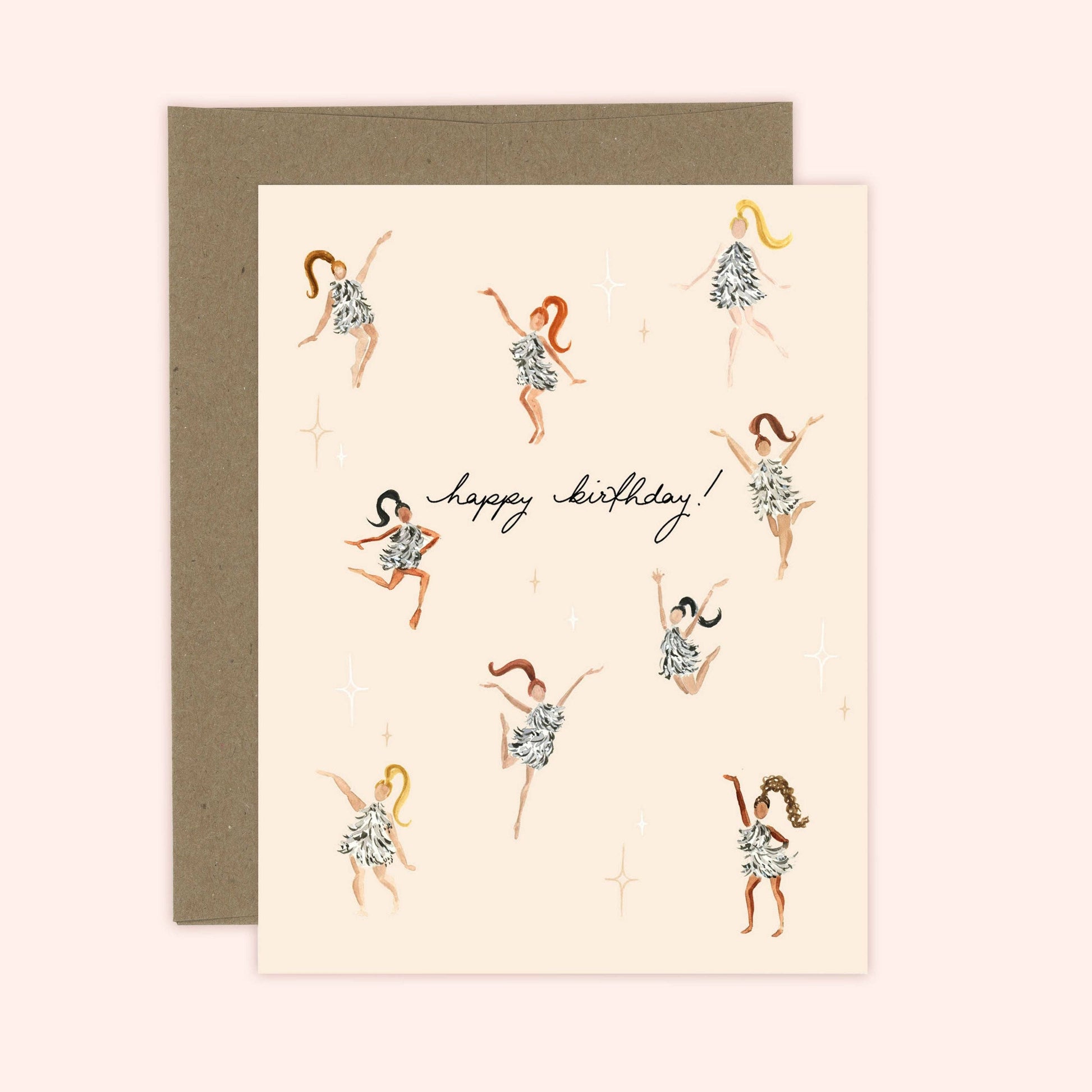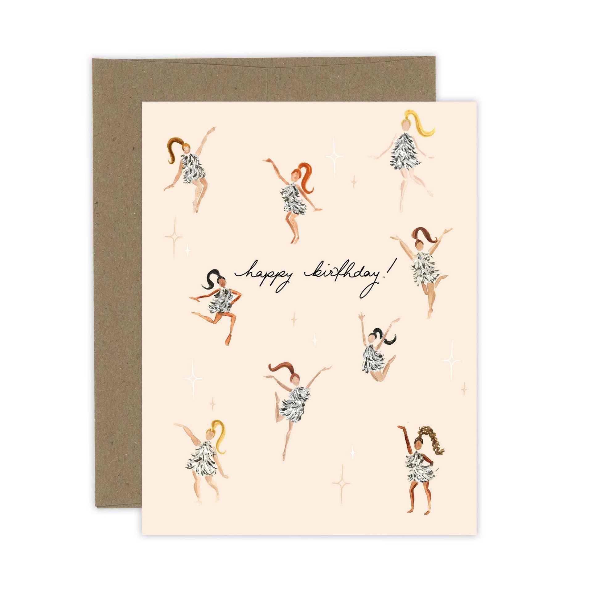 Get the party started with this joyful birthday card featuring watercolor illustrations of dancing girls in sparkling disco dresses. Bursting with movement, color, and retro flair, this design is perfect for celebrating someone with a big heart and even bigger birthday energy. Printed on high-quality textured cardstock with a blank interior, it’s ready for your personal birthday wishes. A fabulous way to say, "Let’s celebrate you!"