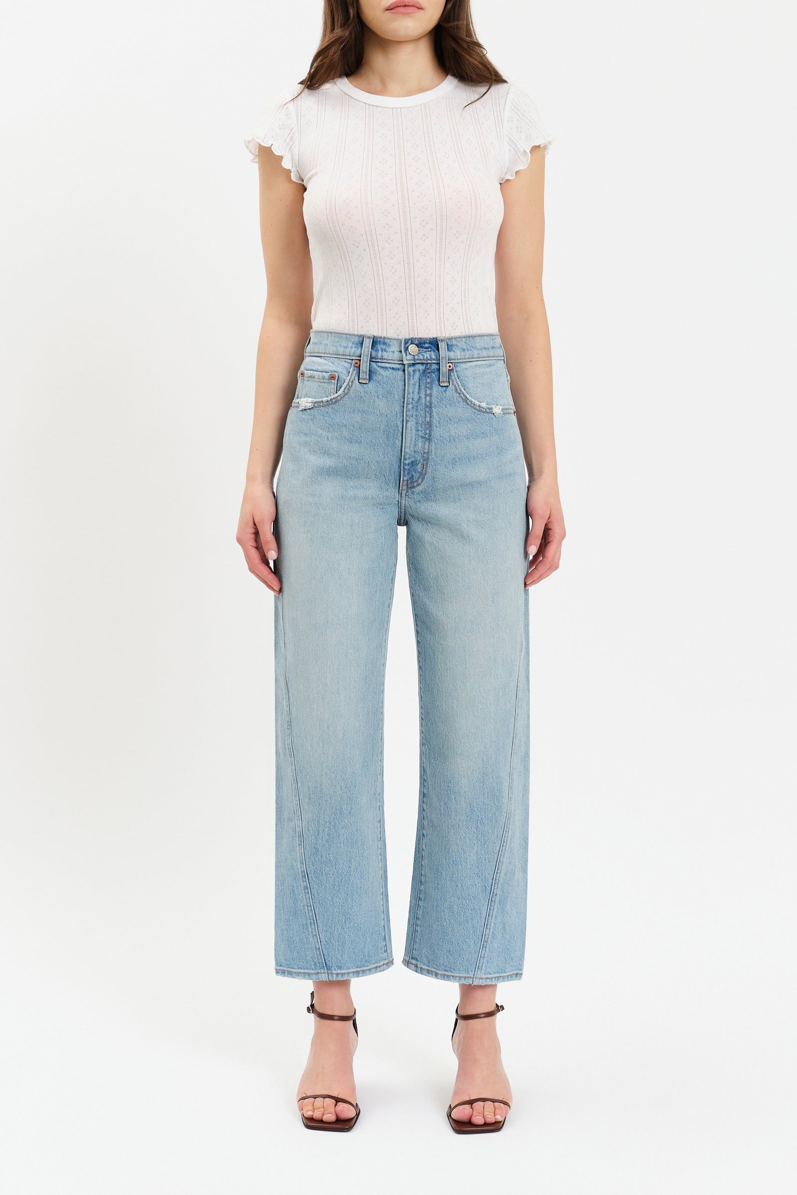The Westward is a high rise jean with a barrel leg silhouette. Featuring a cinched waist, bowed leg, and slightly tapered ankle against a timeless light wash, this jean is as versatile as it is flattering. Constructed from our Tough Love Fabric, this pair is mostly rigid but yields to your body in all the right ways.