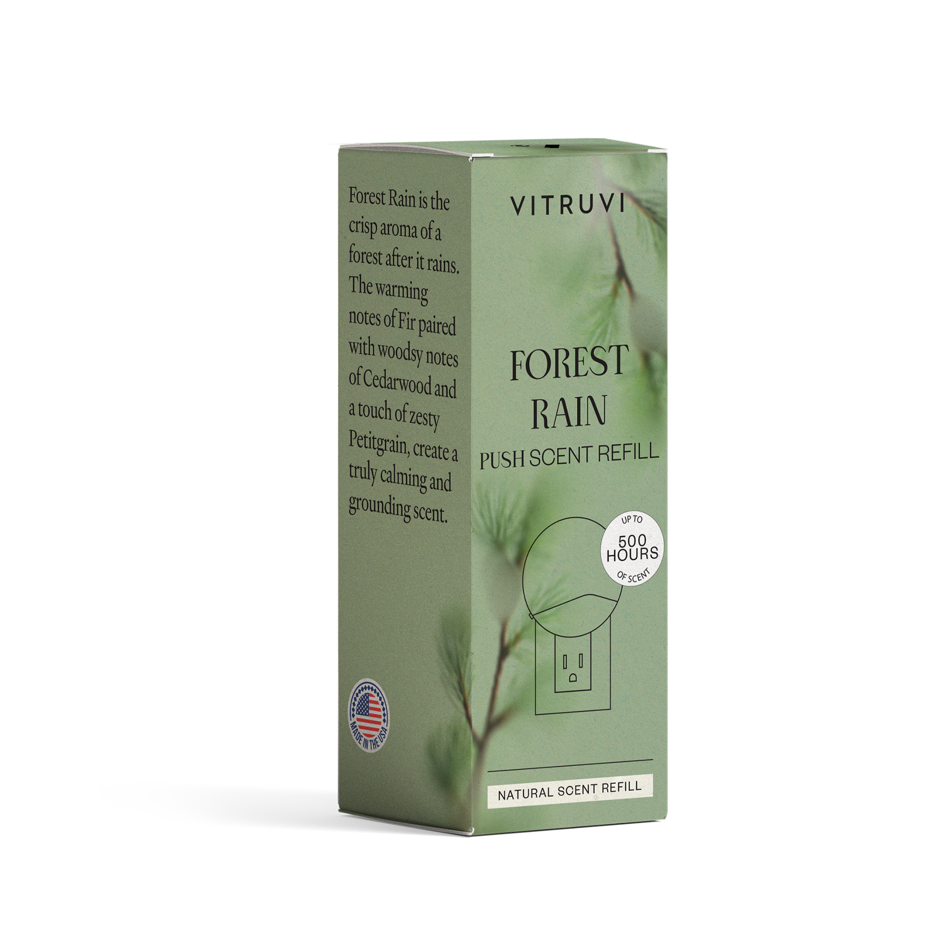 For use with Vitruvi Push Plug-In Wall Diffuser - https://www.faire.com/product-based-collection/pbc_ebqegrjaek Forest Rain is the crisp aroma of a forest after a gentle rain. With warming notes of Fir, woodsy Cedarwood, and a touch of zesty Petitgrain, it’s a calming and grounding scent that brings the serenity of nature into your space.