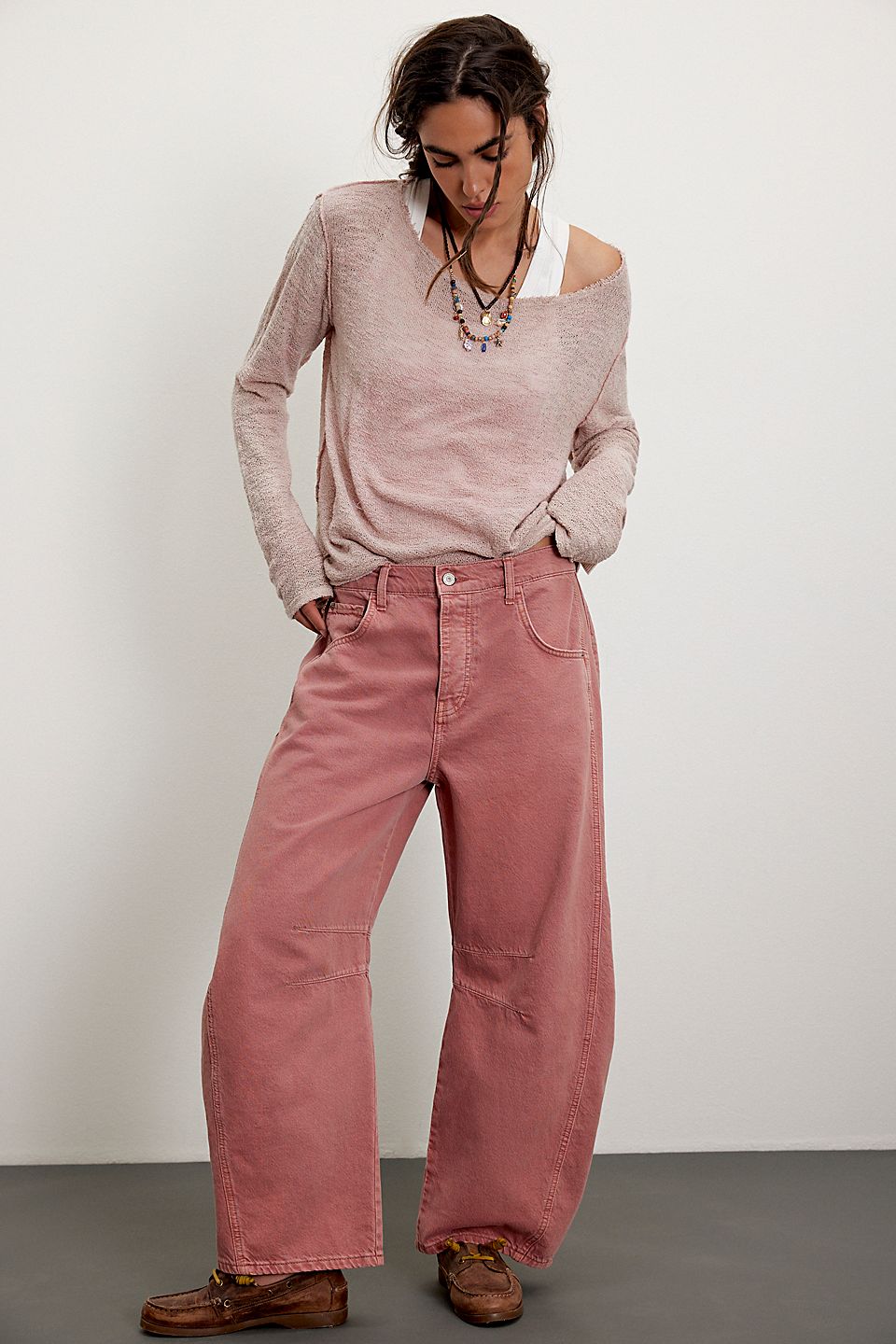 So bold barrel jeans from We The Free collection featured in a mid-rise fit with subtle distressed detailing and wide-legs that taper at the ankle.