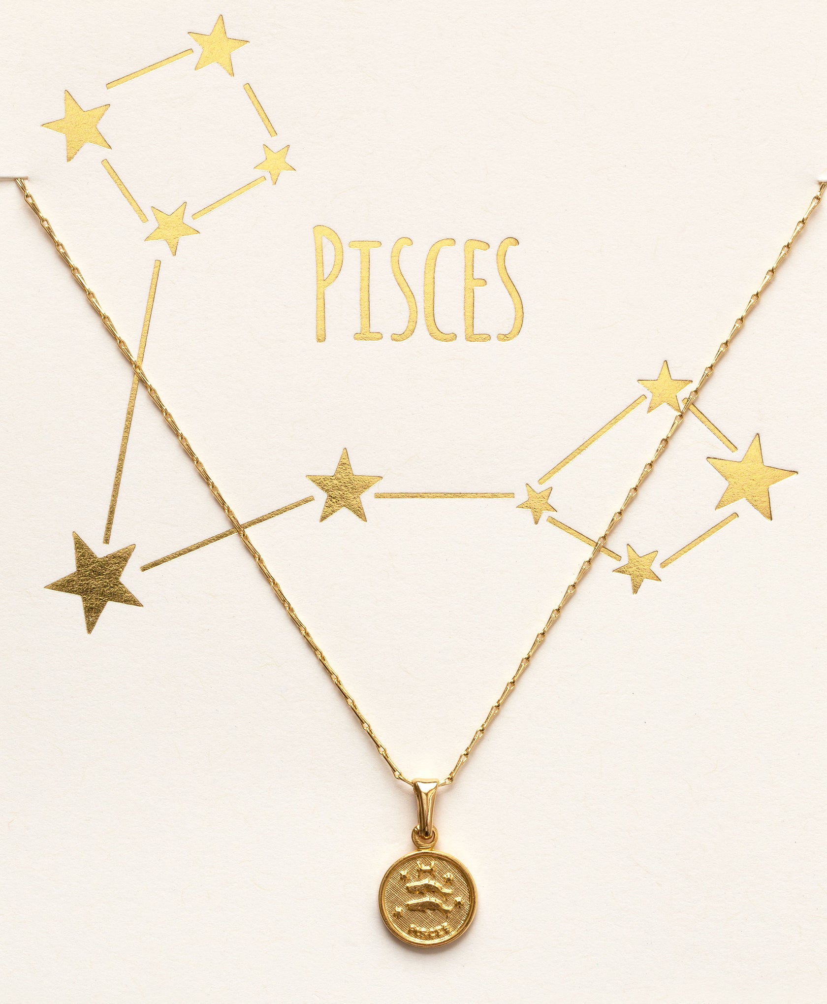 Adorable 1 cm diameter vintage zodiac medallions on 16" + 2" barley chain. 14k gold over brass. Carded on 100% recycled paper, letter pressed gold foil.