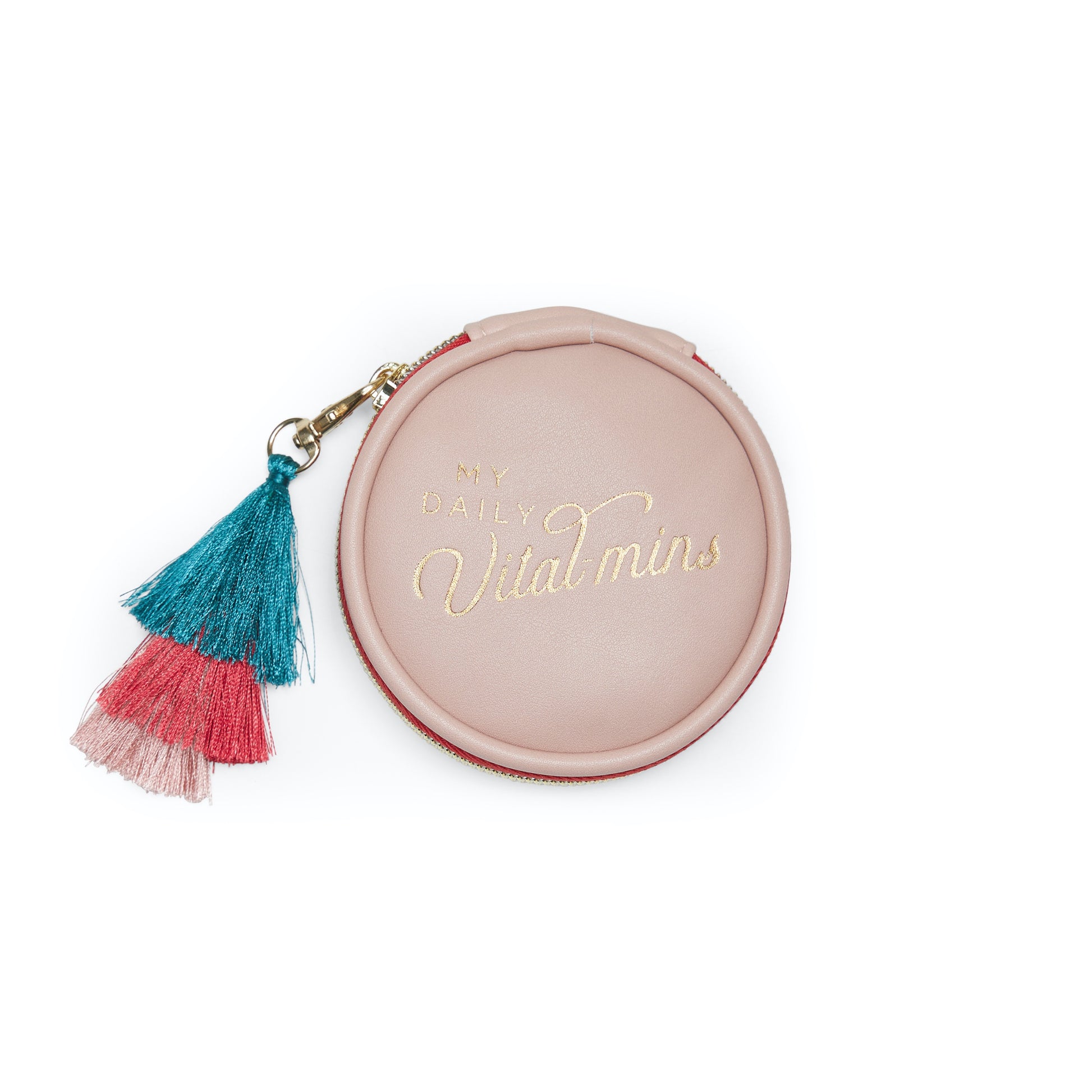 Stay organized and on track with the Vegan Leather Travel Pill Case with Tassel - "Daily Vital-Mins" from Designwork Ink. This compact travel pill case keeps your medications and vitamins organized in a cute, convenient case. Featuring labels with the days of the week and a zipper closer, all your supplements and necessities are secure and neatly stored in your bag or suitcase.