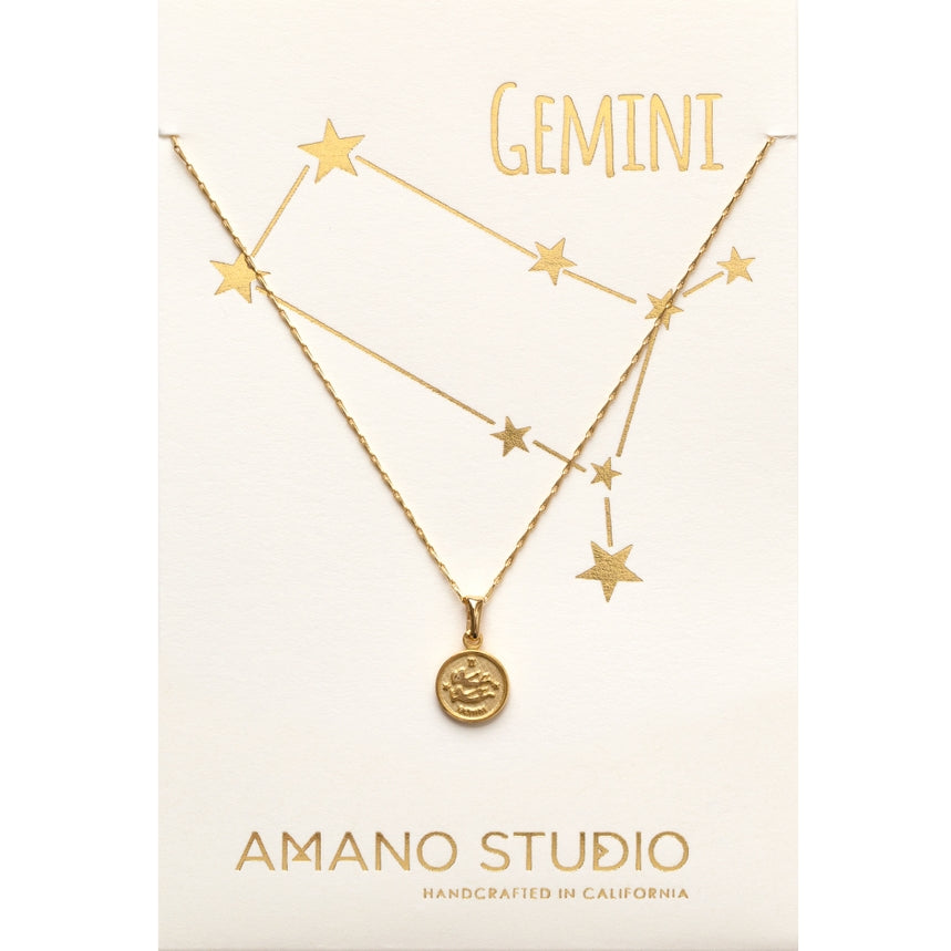 Adorable 1 cm diameter vintage zodiac medallions on 16" + 2" barley chain. 14k gold over brass. Carded on 100% recycled paper, letter pressed gold foil.